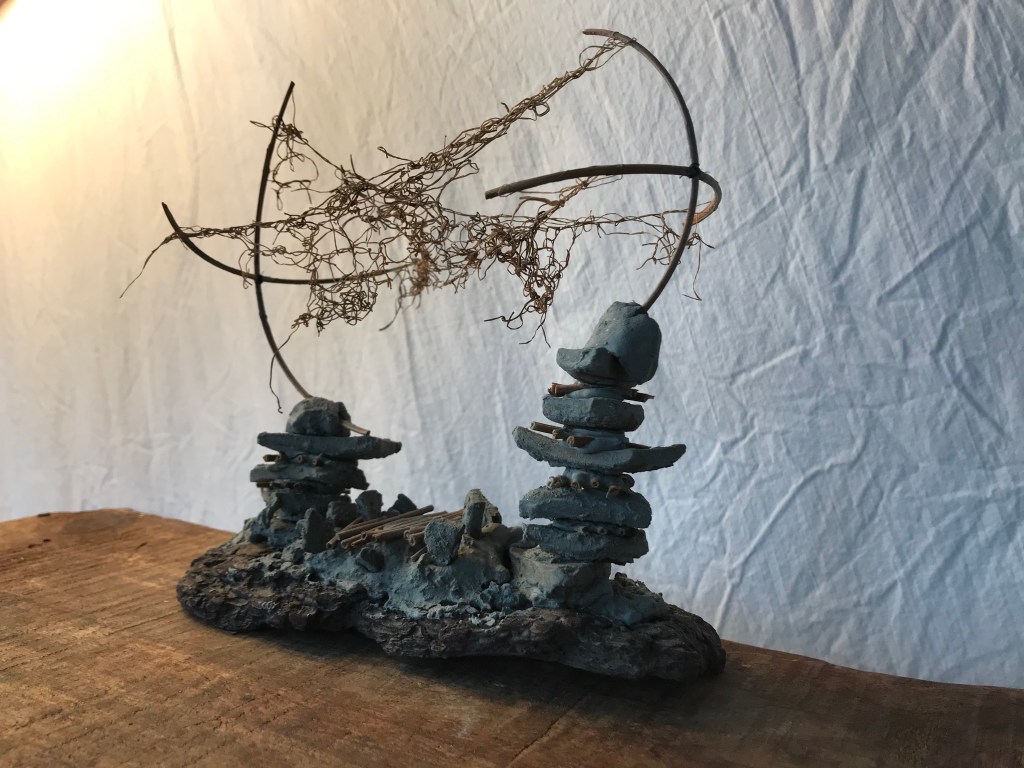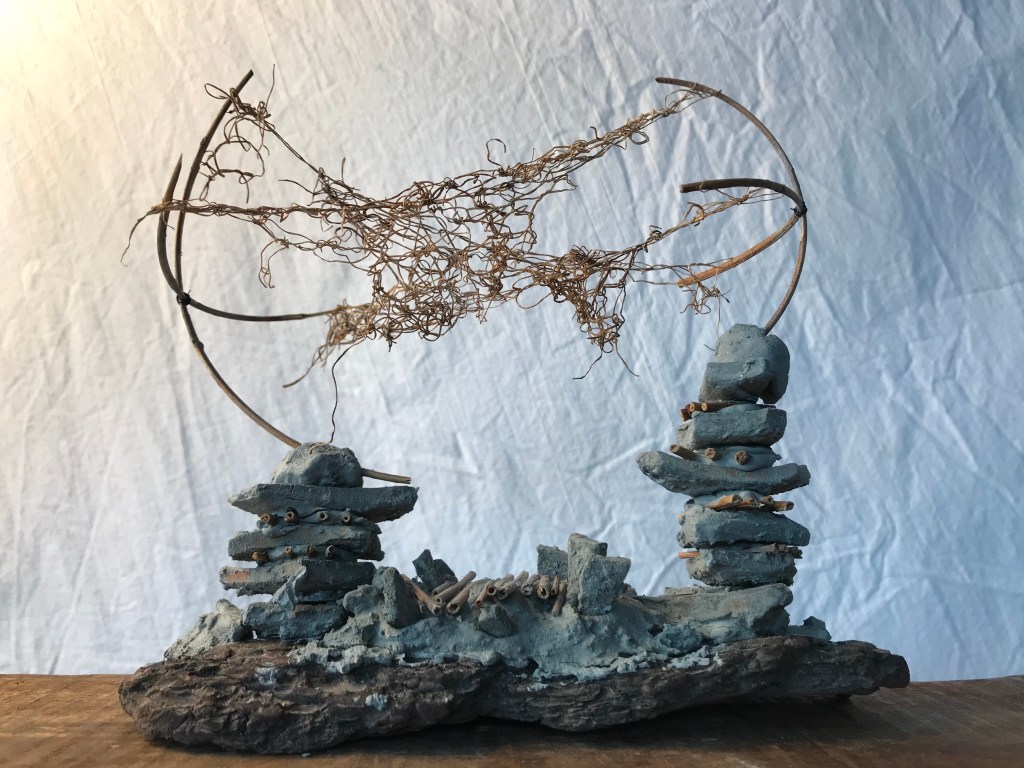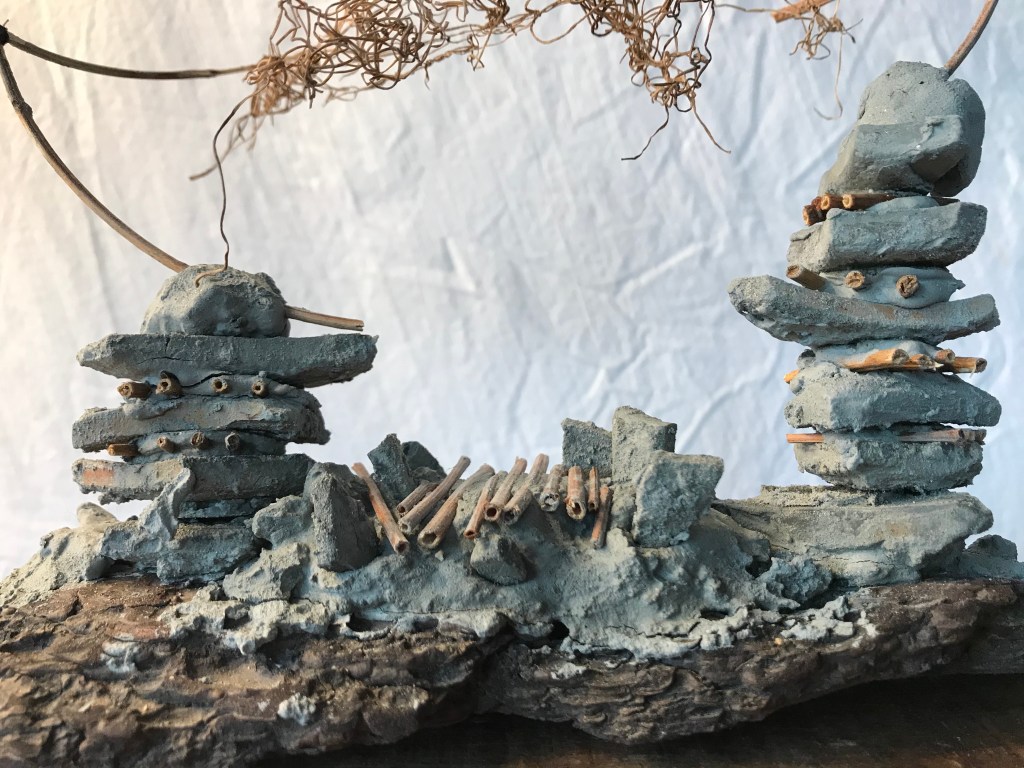River clay blocks stacked on thin Japanese knotweed.