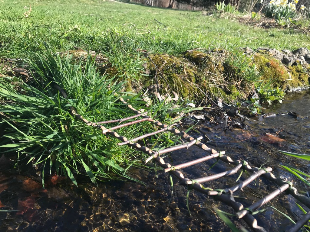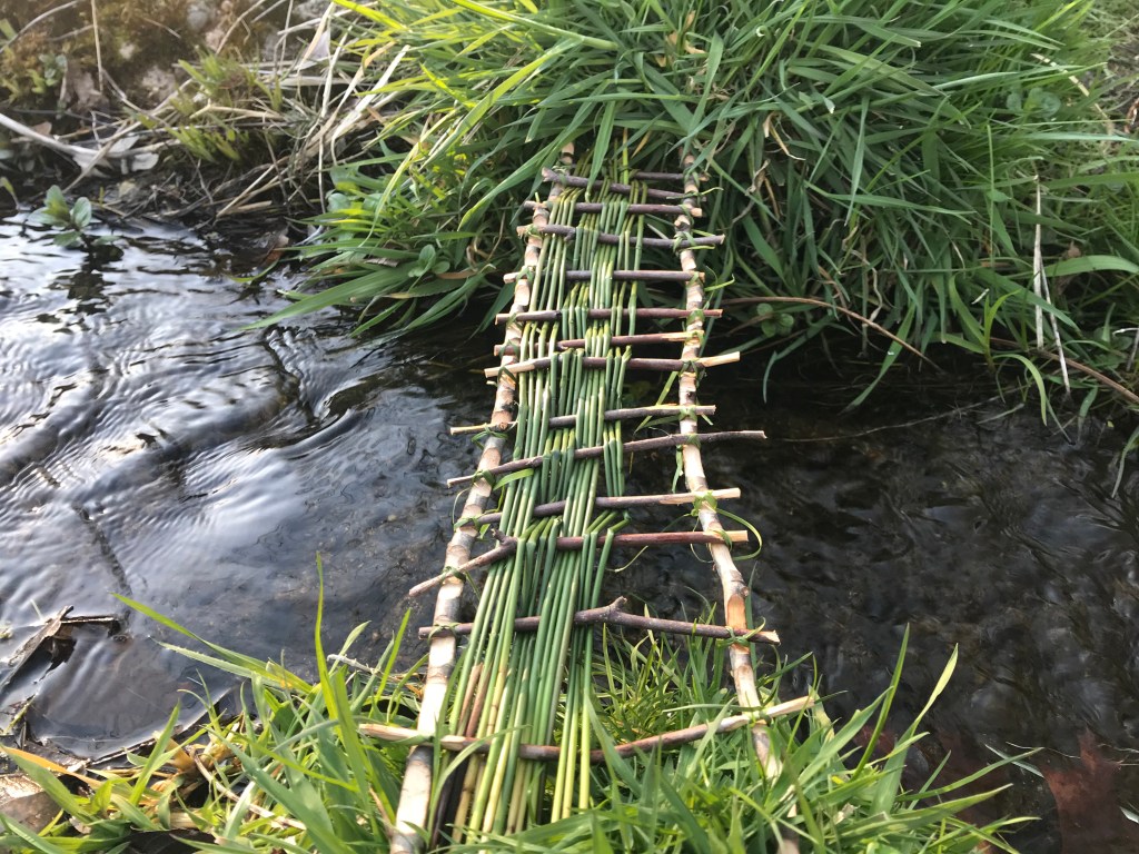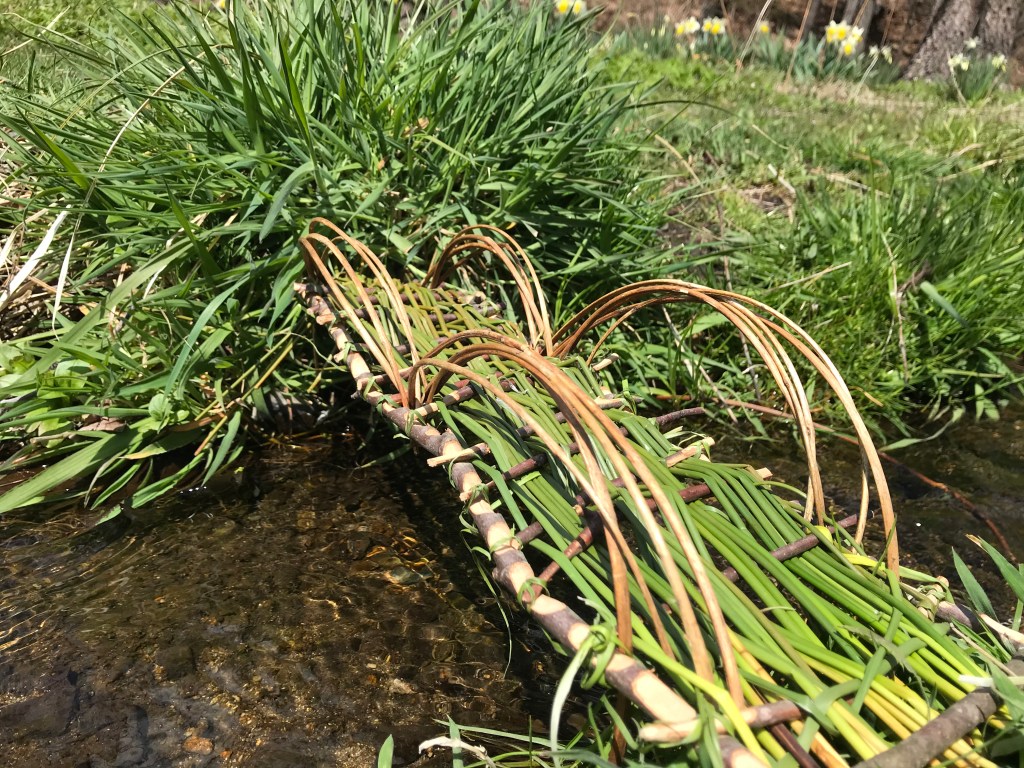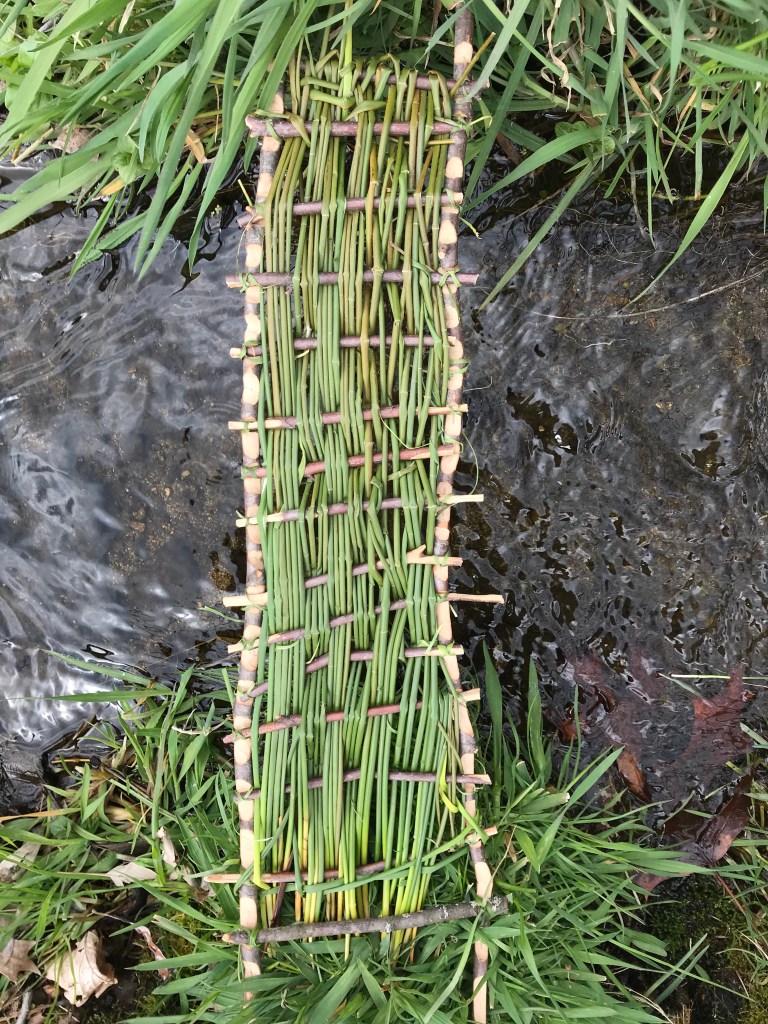 A small woven bridge in the botanic garden joins two sides of a stream. Bridging gaps with what is available. Joining opposite sides with materials that occur in our immediate environment. Materials that are scavenged and transformed. A bridge bringing pause. Purposeless, over a stream.